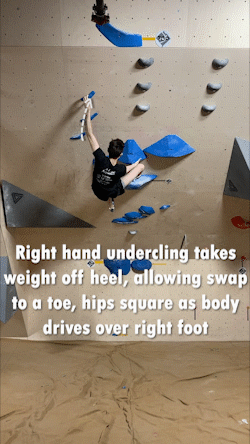 He sinks his hips and drives his weight over his left foot in conjunction with pulling through with his arms in order to generate momentum to the left-hand sloper.