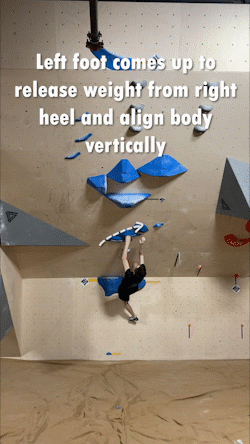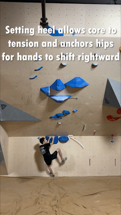 Ray begins by setting a right heel hook. This sets his hips below his hands and prevents them from falling too far out from the wall.