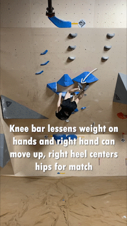 The high heel and matched hands put Ray in a restricted position. He begins to move his left hand outward to the crimps. This opens his chest to the wall, while subsequent bumps create more space for his body to maneuver.